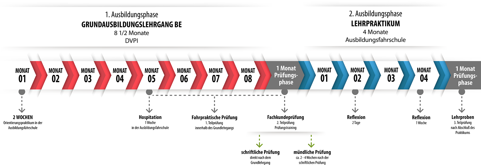 Die Ausbildung in der Ausbildungsfahrschule wird durch die „Reflexionstage“ im 1. Monat sowie durch einen 2-tägigen und am Ende der Ausbildung durch einen 1-wöchigen Lehrgang beim DVPI unterbrochen. Die Ausbildung zum Fahrlehrer schließt mit der theoretischen und praktischen Lehrprobe. Diese kann frühestens 4 Monate und muss spätestens 2 Jahre nach Erteilung der Anwärterbefugnis erfolgen.